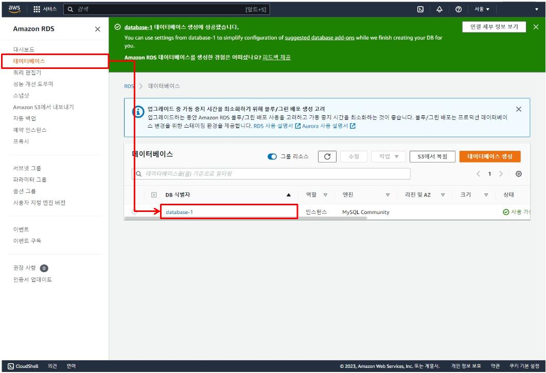 2. "데이터베이스"탭에서 원하는 DB 정보를 클릭한 후, "앤드포인트" 값을 복사합니다.