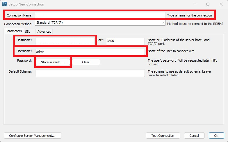 * Password: "Store in Vault..." 버튼 클릭 후 마스터 계정의 패스워드를 입력
