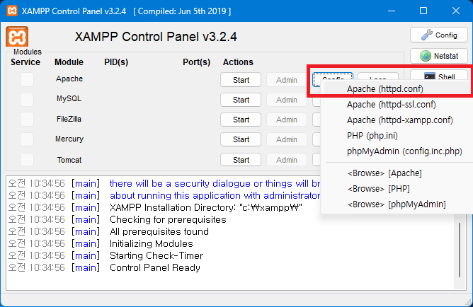 1. "Apache - Config - Apache (httpd.conf)"를 클릭합니다.