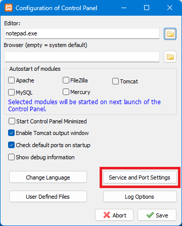 2. "Service and Port Settings" 버튼을 클릭합니다.